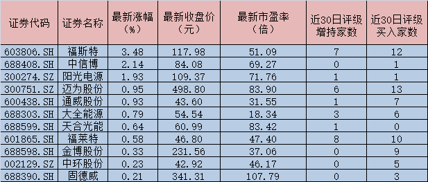 进一步梳理发现,在30只个股中,赛伍技术、大金重工、中信博、金博股份、通威股份、帝科股份、航天机电、大全能源、隆基股份等9只个股最新收盘价较机构给予的最高目标价,仍有60%以上的上升空间。